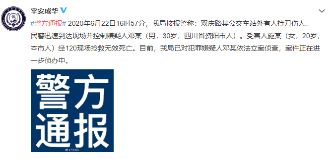 据成都市公安局成华区分局官方微博消息:2020年6月22日16时57分,我局接报警称:双庆路某公交车站外有人持刀伤人。民警迅速到达现场并控制嫌疑人邓某(男,30岁,四川省资阳市人)。受害人施某(女,20岁,本市人)经120现场抢救无效死亡。目前,我局已对犯罪嫌疑人邓某依法立案侦查,案件正在进一步侦办中。