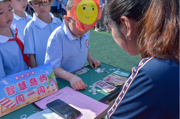 生活离不开数学,当数与形融于真实情境,又会碰撞出怎样的思维火花呢?瞧!老师们专门为学生制定了符合低年级学情的趣味闯关“专属套餐”——“数字海洋”、“位置迷宫”、“智慧岛屿”“拼图达人”“计算能手”“时间主人”等闯关项目。面对新颖的问题,孩子们才思敏捷、手脑并用、表述清晰,小小的他们尽显智者风范!