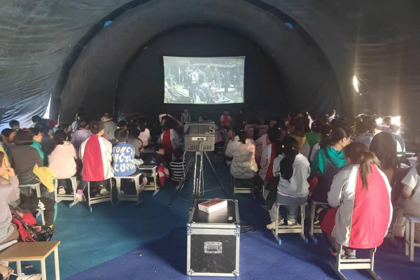 在操场的大棚内,师生正在聚精会神地观看爱国主义影片《烽火地雷战》,影片播放真实事件,同学们的感情也随着故事情节的推进变化,一个个动人心魄的场景,感染着现场每一个人。
