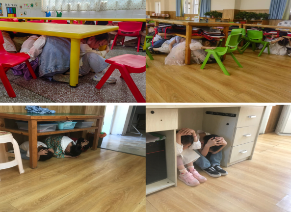 随着预警铃声的响起,老师们组织孩子快速避险,引导幼儿迅速抱头,躲在桌子下或墙角,尽量蜷曲身体。