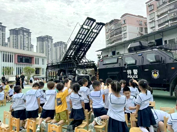 特警叔叔向孩子们介绍了特警的工作职责、枪械装备,引发了孩子们浓厚的兴趣。近距离接触装甲车、攀登突击车、无人机、防弹防爆盾牌、手枪等;特警叔叔耐心的讲解、示范。每一样装备都让孩子们的眼睛发亮。