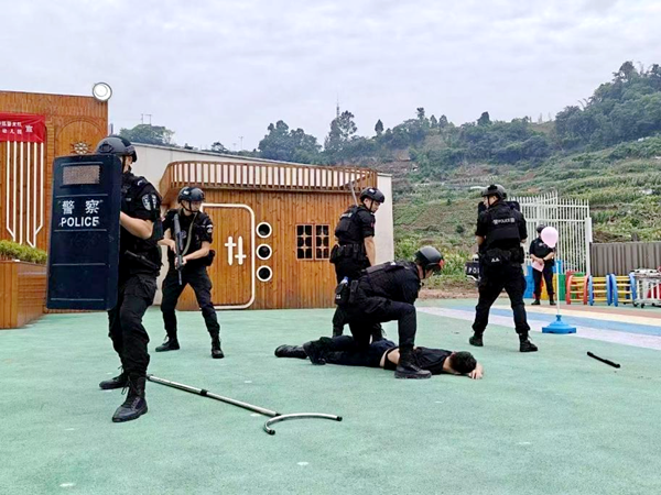 特警人员进行了反恐防暴演练。演练中特警教官详细讲解并示范了盾牌、钢叉、长棍等安防器械的使用方法和基本的防守等战术知识,增强了教师和安保人员应对幼儿园突发事件及防范暴力伤害的应急处置能力,为平安和谐校园建设奠定了坚实的基础。