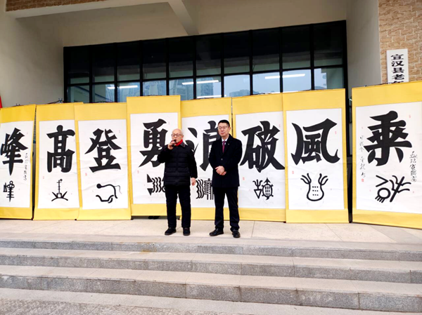 原县委常委、副县长、宣汉县老年书画研究会会长钟建文致辞,并与宣汉县委组织部副部长、县委老干部局局长姜本君,宣汉县教育局党组成员、总督学熊邦国,宣汉职专党委书记张远彬共同揭牌。宣汉县老年书画研究会会员饶庆发老师向宣汉职专进行书法捐赠,宣汉职专党委书记张远彬代表该校接受捐赠,并致答谢词。