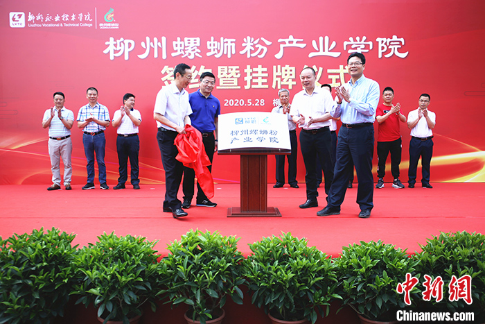 5月28日,柳州螺蛳粉产业学院在广西柳州职业技术学院成立,这是中国首家螺蛳粉产业学院,计划每届培养学生约500名。图为签约暨挂牌仪式。中新社记者 朱柳融 摄