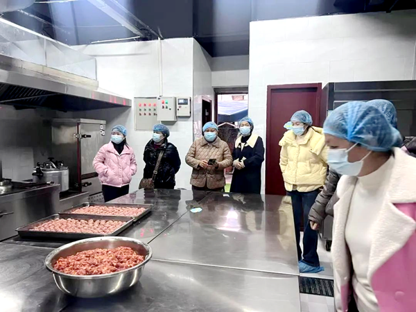 交流会后,在黄小丽园长的带领下,膳委会成员参观了食堂后厨,包括加工间、仓库、消毒间、备餐间等,深入了解食堂的运作流程。食堂工作人员严格按照“生进熟出”的标准操作,确保从食品原料到成品的流程不交叉,生熟分开,有效防止交叉感染,保障幼儿的食品安全、营养和健康。