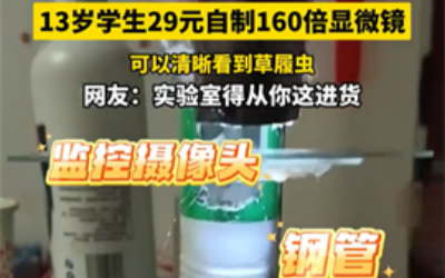 近日,四川广元。13岁初一学生用钢管板纸、胶水、二手摄像头、目镜玻璃、打火机及反光镜等自制显微镜,放大倍数可达160倍,共花费29元,可观察草履虫、线虫等。