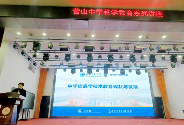 本次活动邀请到了西南交通大学的王红军教授前来讲座。王教授讲座的题目是《中学信息学技术教育现状与发展》。讲座中,他为同学们介绍了信息学奥赛的相关情况,分析了县域中学学生在信息技术学习中存在的不足,剖析了发展趋势,分享了信息素养提升的理念和实践路径,让同学们对信息技术科学有了更深刻的认识。