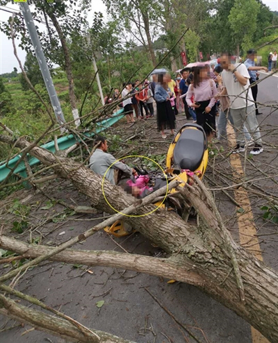 5月27日下午5时许,遂宁大英县卓筒井镇吴家桥村蓬乐公路边,一棵干枯的大树突然倒了。正在公路边卖桃子的罗大姐目睹了事发经过。她说,当时无风无雨,她正埋头整理筐里的桃子,突然听到咔嚓咔嚓的响声。抬头看时,距离她大约有30米远,马路斜对面的这一棵大树突然倒下,一辆电动自行车经过树下,树干砸在电动自行车上。一名老人的脸上、腿上都在流血;一名小女孩躺在地上没有了动静!这条路平常车辆和行人较多,当时又是放学时间,大家很快聚集过来。罗大姐打了报警电话,有人上前把树枝扒拉开。