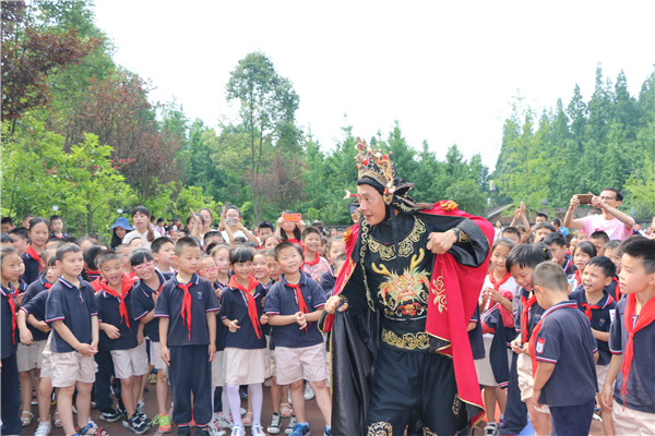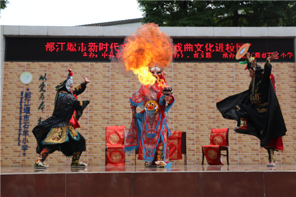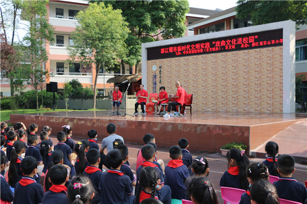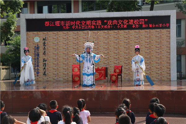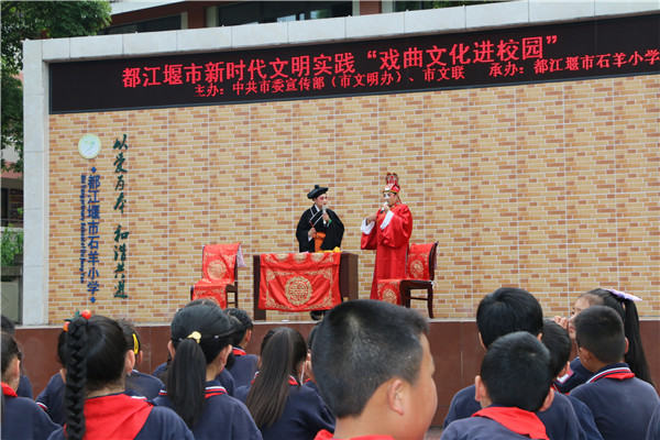 弘扬、普及传统文化,传承、传播国粹艺术,一直是中华民族得以昌盛繁荣的根本所在。为了弘扬民族文化,弘扬家乡川剧艺术,让更多的孩子领略川剧的艺术魅力,都江堰市委宣传部、文明办、文联等上级单位组织了戏曲进校园活动。6月10日上午,各级领导以及成都市专业川剧演艺团队来到了都江堰市石羊小学,为孩子们呈现了一场精彩的表演。