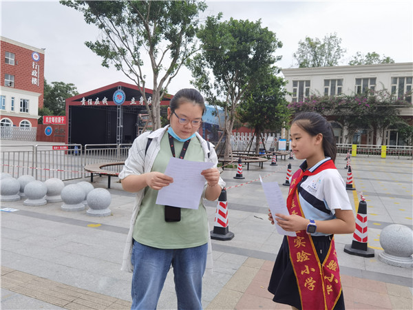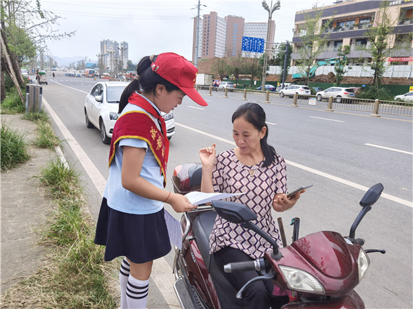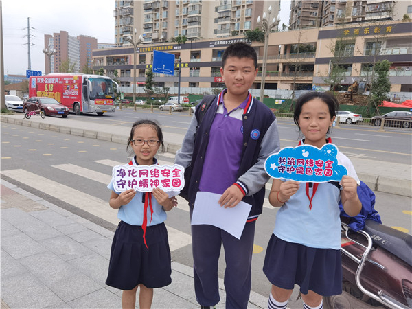 少先队网络安全宣传“小小志愿者”走上街头,向行人宣传要提高网络安全意识