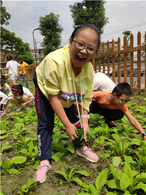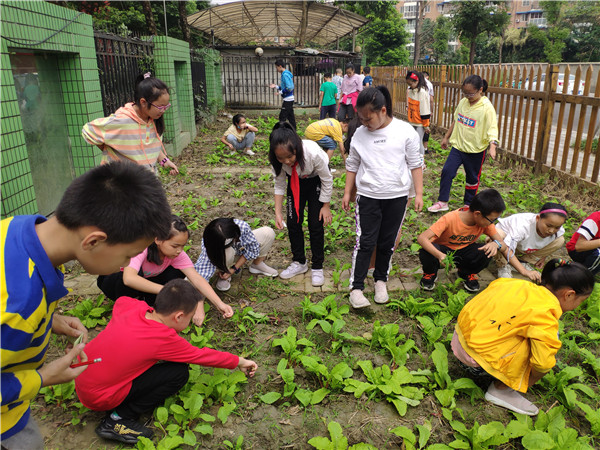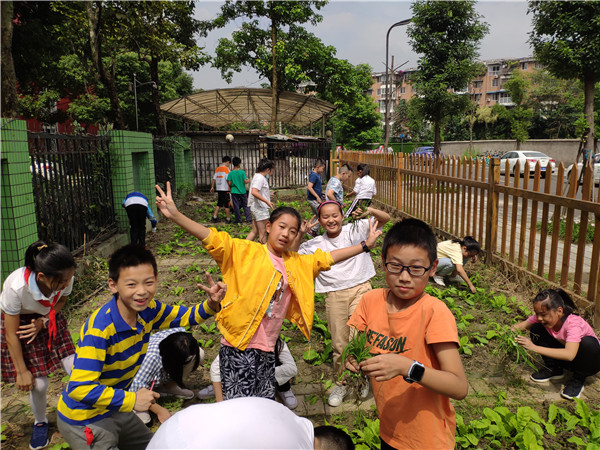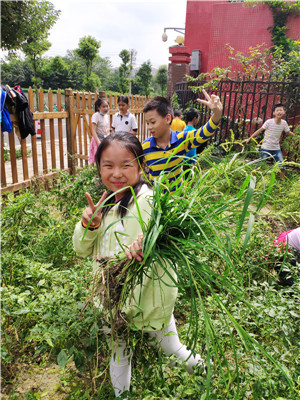 金秋九月,成都市实验小学明道分校(以下简称:实小明道分校)五年级四班全体同学在科学老师周小松的带领下,来到学校农事劳动教育基地——童乐田园,参加了除草、播种等系列活动。