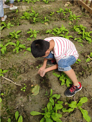 随后,学生们以小组的形式开展活动,清除掉划分区域中的杂草。伴随着孩子们的欢声笑语,杂草清理工作很快完成,农事基地管理员张叔叔又带着他们播撒小白菜种子,在告知播种技巧和小白菜生长特点后,学生们小心翼翼地将种子播撒进土中。