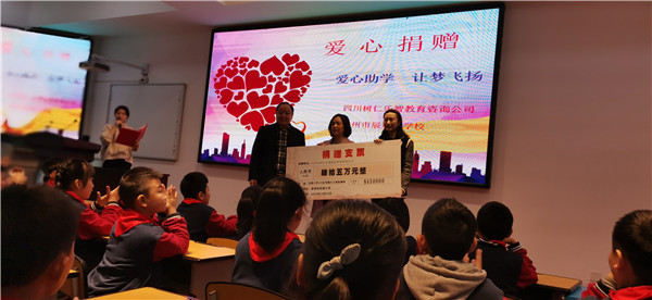 最后举行捐赠仪式,四川树仁乐智教育咨询公司向辰居小学捐赠150台电脑,辰居小学向捐赠方赠送锦旗,表达谢意。