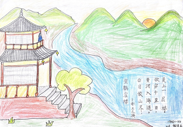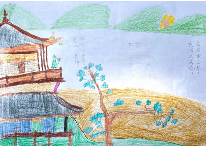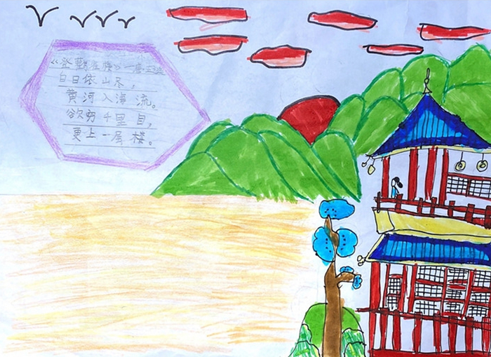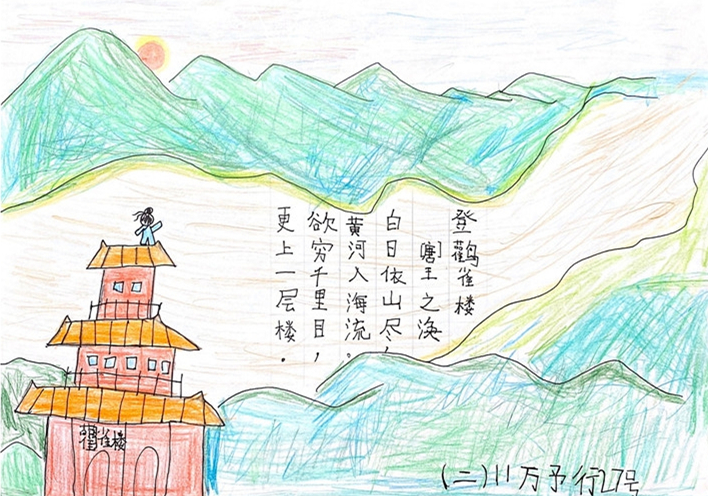 近日,在学习完古诗《登鹳雀楼》后,成都市金沙小学2019级11班开展了古诗配画特色作业展评活动。孩子们根据自己对古诗的理解,抓住诗中的一两处关键,用画笔将诗歌描绘的美景画成精美的图画。