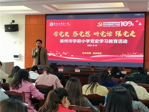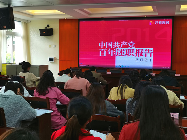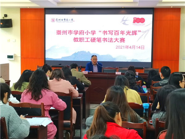 4月14日中午,学府小学全体党员和部分教师在教师学习室开展了“党史学习教育”主题活动,一起观看《中国共产党百年述职报告》视频,现场开展了“书写百年光辉”教职工硬笔书法比赛。