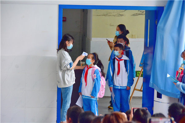 演练中,境界师生模拟了每日晨检,严格按照“一测体温,二看,三问”的流程仔细检查了学生的身体状况,发现有异常症状的学生,按照要求及时联系卫生老师,经确认后根据具体情况留校观察,或联系父母及时就医,并且严格填写《成都市学校晨午检结果登记本》,根据学生病历诊断填写《学生因病缺课和患病人员追踪情况登记本》。卫生老师及时上报校领导、青羊区教育局、青羊区疾控、东坡卫生执法中队、健康副校长,同时填写好《传染病登记本》和《传染病患儿居家隔离治疗记录表》。整个演练过程既有序又真实,展现了境界老师细心耐心、尽职尽责的工作态度,体现了长期以来学校卫生工作的扎实有效。