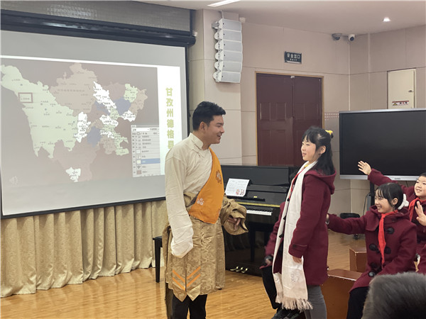 歌曲《吉祥的祝福》蕴含着浓浓的藏族风情。歌声中,同学们一一走进教室,四郎副校长从德格地理位置、自然风光的介绍,藏族节日歌舞的学习,日常藏语的普及,哈达敬献的体验等环节让孩子们感受到了藏族传统文化的魅力。