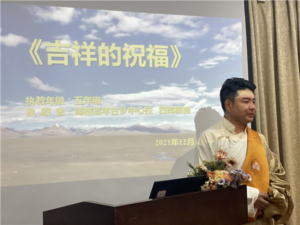 2021年12月30日,来自甘孜州德格县年古小学的四郎降措副校长在成都高新区西芯小学跟岗学习近三个月后,在西芯小学多功能厅以一节音乐公开课——《吉祥的祝福》展示了自己的学习收获,带领西芯小学五年级(1)班的孩子唱藏歌、跳藏舞、了解藏族习俗,谱写了一曲民族团结、文化交流的美好乐章。