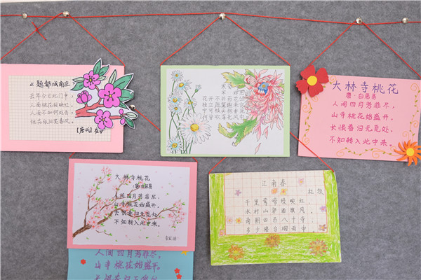 飞花令诗句流转在孩子们的朗朗读书声中,中华传统文化浸润在孩子们烂漫的心田。孩子们将花的诗文写于卡片之上,手绘诗词卡被老师们展示在教室之外。美术老师带领孩子们描绘花的世界,五彩线条里交织着孩子们对花、对春天、对美的喜爱与追求。