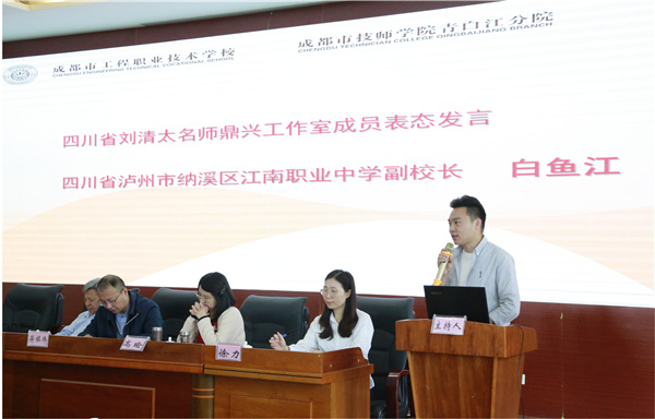 泸州市纳溪区江南职业中学副校长白鱼江作为工作室核心成员代表进行了发言,他表示在名师的带领下,一定要充分借助优良的专家平台,在学习中拓宽眼界,在实践中增长才干。树立坚定目标,奋力前行,为中国育工匠,为天府育英才。