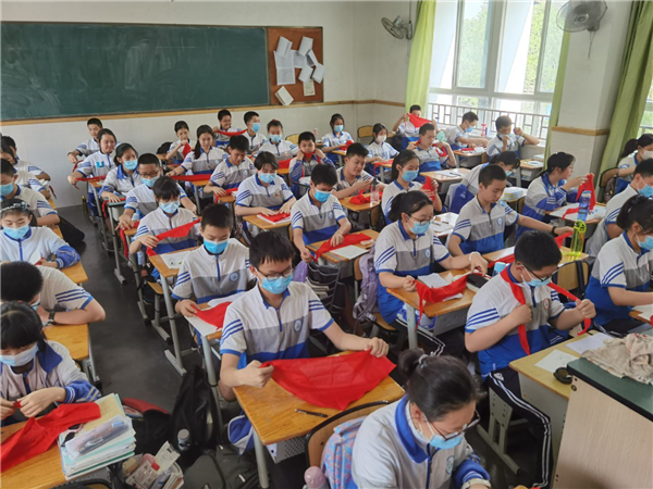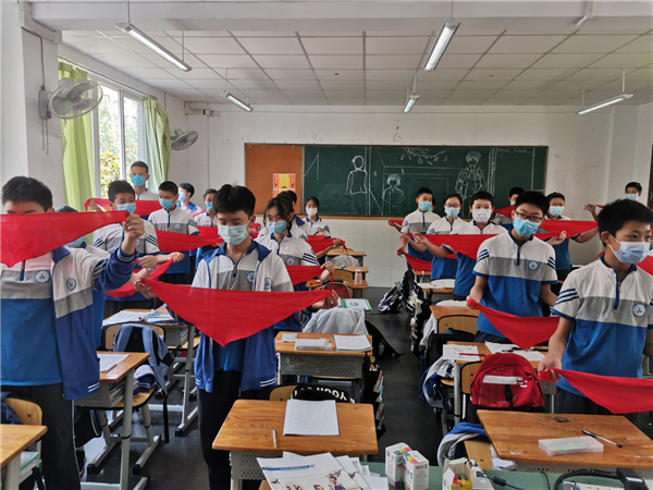 最后,两位主持人宣布2021届少先队退队。同学们将胸前的鲜艳红领巾郑重摘下,叠好,与少先队郑重地说“再见”。