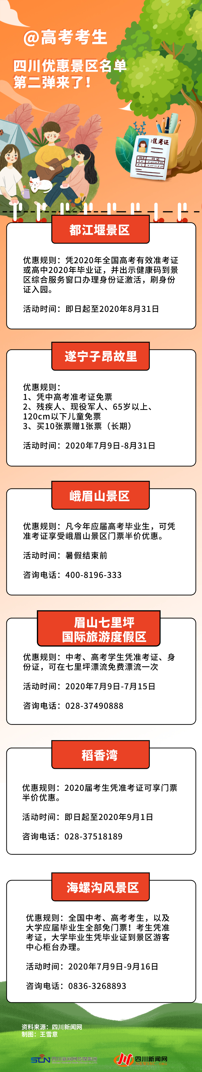 高考考生注意了!准考证不要扔,带着来四川耍个过瘾!记者从四川省文旅厅获悉,针对高考考生的第二批四川优惠景区名单来了。