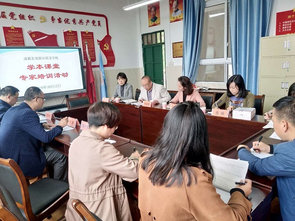 2020年10月12日,成都市第四十三中学校(以下简称:四十三中)李靖宜主任一行4人受邀走进成都东部新区回龙学校,开展学本课堂专项培训活动。回龙学校校长姜晓强及相关领导、相关学科教师参加了此次培训。
