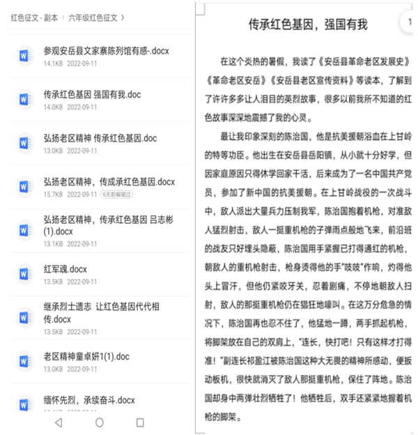 全校四至六年级学生在老师的组织下,参观安岳革命烈士纪念碑、纪念馆,读县志,访问安岳革命老前辈。通过这些活动,同学们了解了安岳革命老区的红色历史,被革命先烈的英雄事迹深深打动,以手写心,学校共收到48篇红色征文,同学们在文中歌颂了先烈们为实现理想不惜抛头颅洒热血的执着精神。