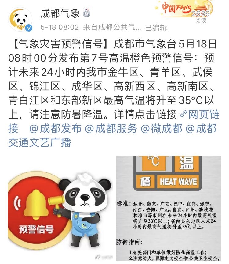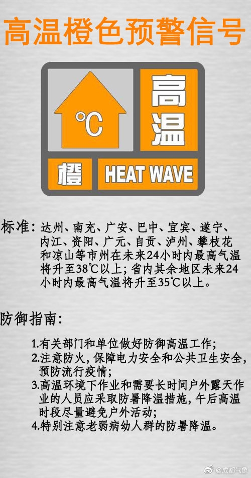 据@成都气象 消息,成都市气象台5月18日08时00分发布第7号高温橙色预警信号:预计未来24小时内成都市金牛区、青羊区、武侯区、锦江区、成华区、高新西区、高新南区、青白江区和东部新区最高气温将升至35℃以上,请注意防暑降温。