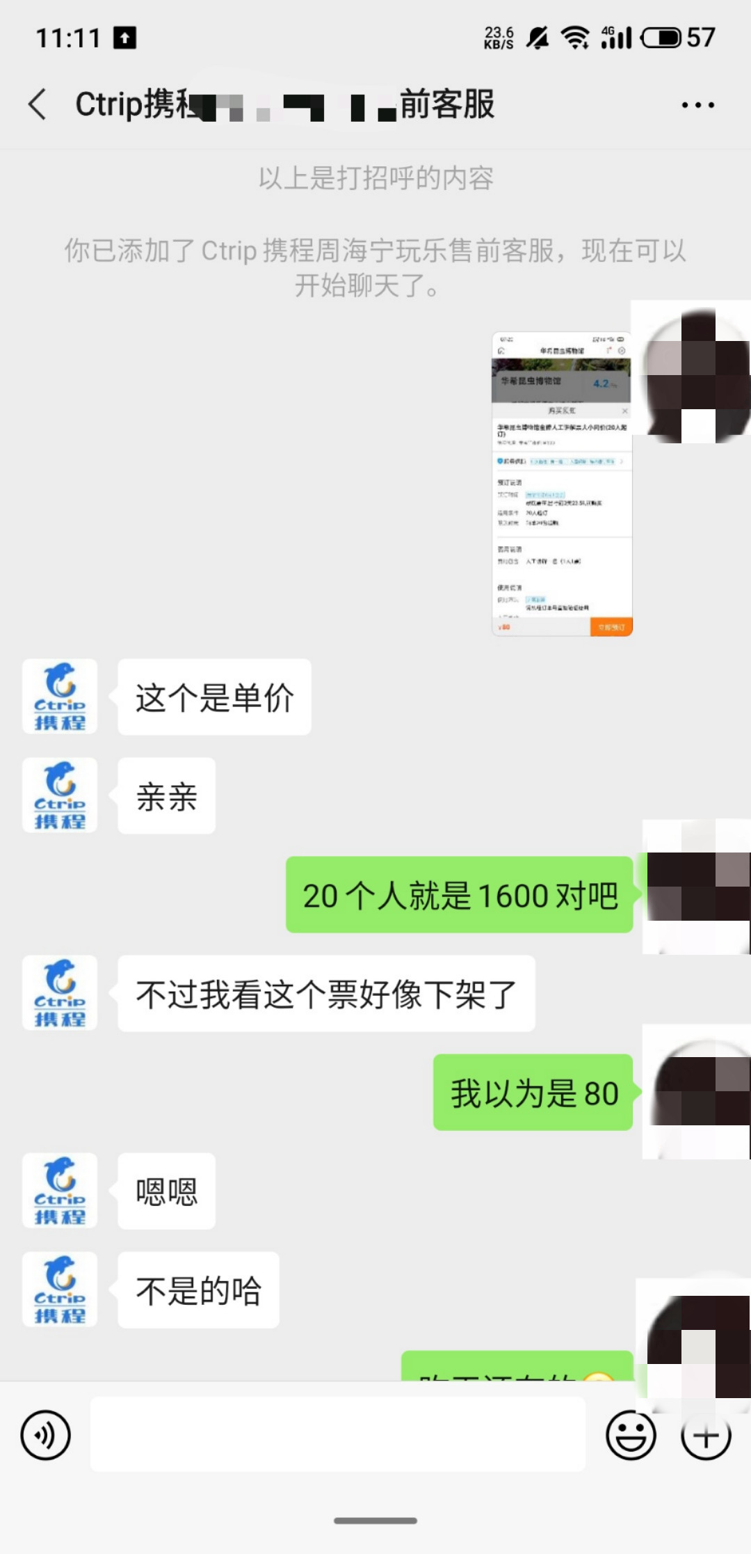 为了证实这80元的人工讲解票是单价,而并非20人总共的费用,红星新闻记者以消费者身份联系到携程平台的售前客服。客服明确向记者表示,80元是“单价”,也即是说20人需要花费1600元的人工讲解费。