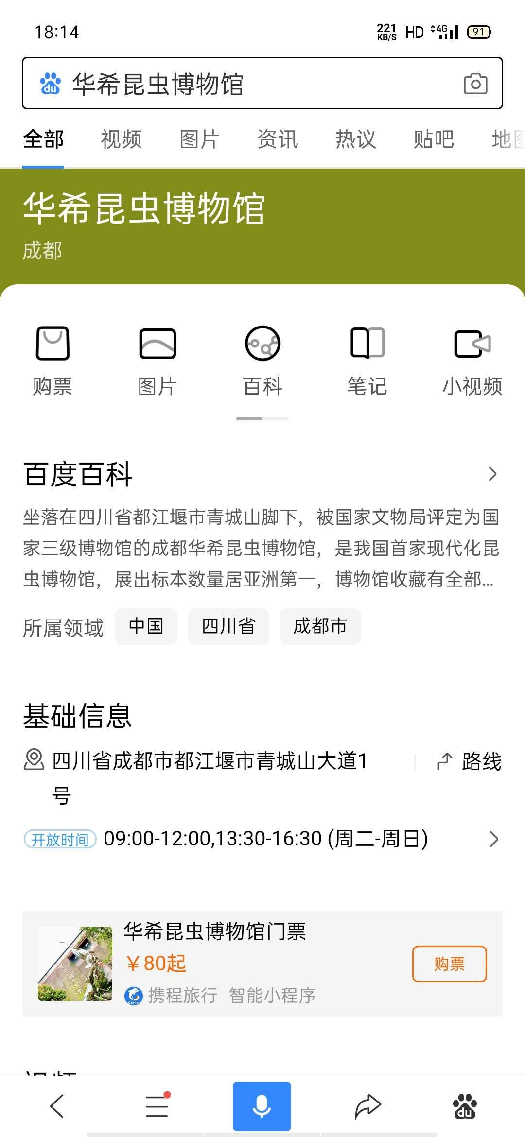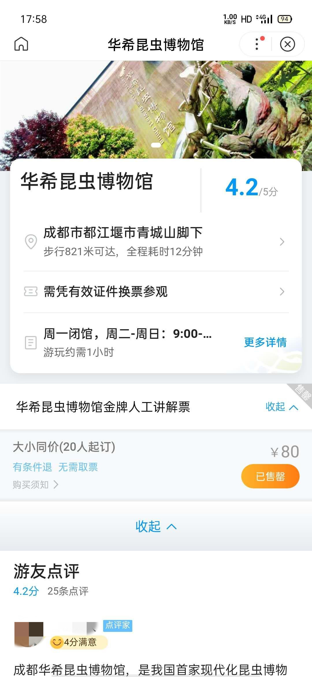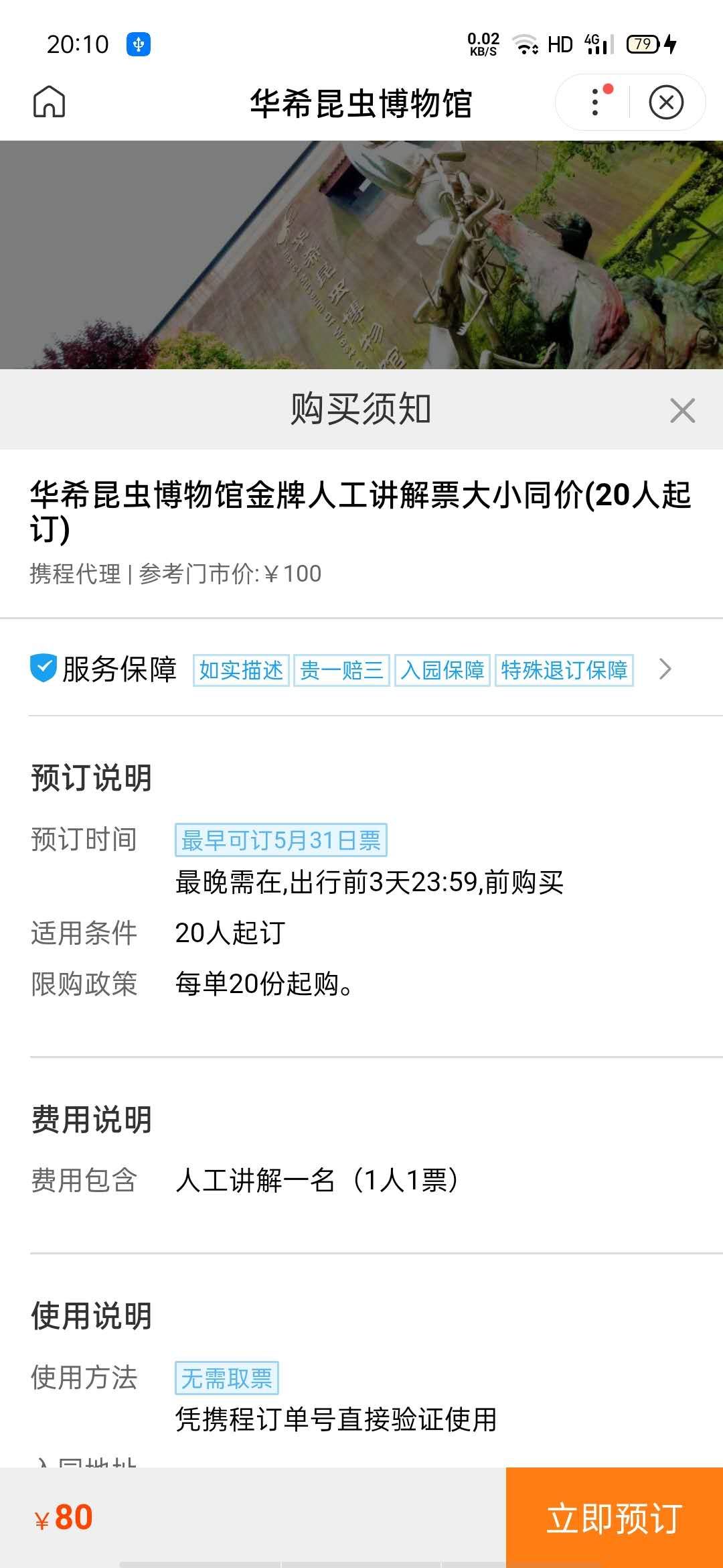 工作人员试着在浏览器中搜索华希昆虫博物馆的名字,没想到靠前的位置就有“携程旅行 华西昆虫博物馆门票”的字样。随后,工作人员试着在携程APP搜索博物馆的名字,购买页面找到了“华希昆虫博物馆金牌人工讲解票大小同价(20人起订)”的旅游产品,费用是80元,费用介绍中指出,其中包含“人工讲解一名(1人1票)”。