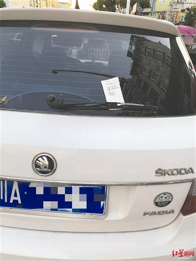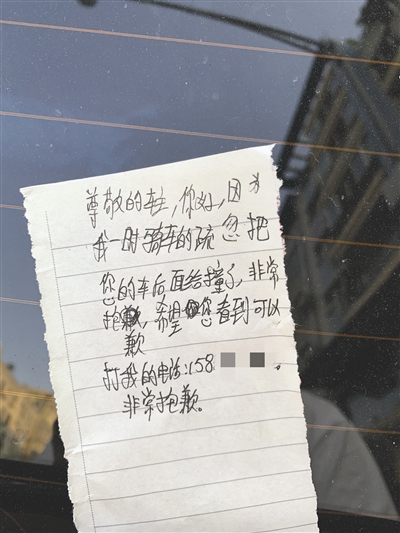 等了一会,没有人来。于是,杨锐丰拿出笔,在一张笔记本撕下的纸条上留下了道歉信和联系方式。“尊敬的车主,您好,因为我一时骑车的疏忽,把您的车后面给撞了,非常抱歉,希望您看到可以打我的电话。非常抱歉。”