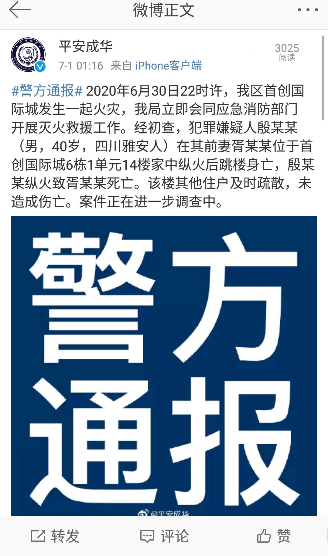 成华警方通报:2020年6月30日22时许,我区首创国际城发生一起火灾,我局立即会同应急消防部门开展灭火救援工作。经初查,犯罪嫌疑人殷某某(男,40岁,四川雅安人)在其前妻胥某某位于首创国际城6栋1单元14楼家中纵火后跳楼身亡,殷某某纵火致胥某某死亡。该楼其他住户及时疏散,未造成伤亡。案件正在进一步调查中。