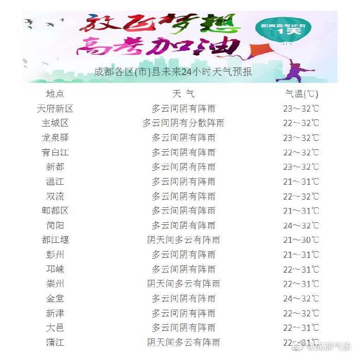 据成都气象台消息,预计高考两日白天主要以多云间阴天气为主,易出现分散阵雨或雷雨,体感比较闷热,最高气温32~33℃,建议参加考试的弟弟妹妹们要注意防暑降温;未来几天夜间多多少少都有阵雨,但是落区主要偏西部;周二晚上阵雨活动范围较大,西部南部局部地方可达大雨到暴雨。