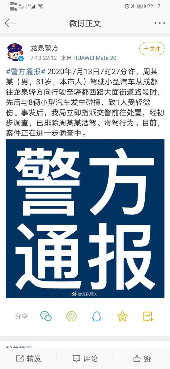 事发后,龙泉驿分局立即指派交警前往处置,经初步调查,已排除周某某酒驾、毒驾行为。目前,案件正在进一步调查中。
