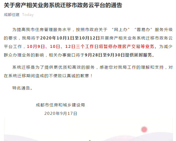 根据《通告》,为提高成都市住房管理服务水平,按照成都市政府关于“网上办”“蓉易办”服务升级的要求,成都市住建局将于2020年10月1日至10月12日开展房产相关业务系统迁移市政务云平台工作,10月9日、10日、12日三个工作日将暂停办理房产交易等业务。