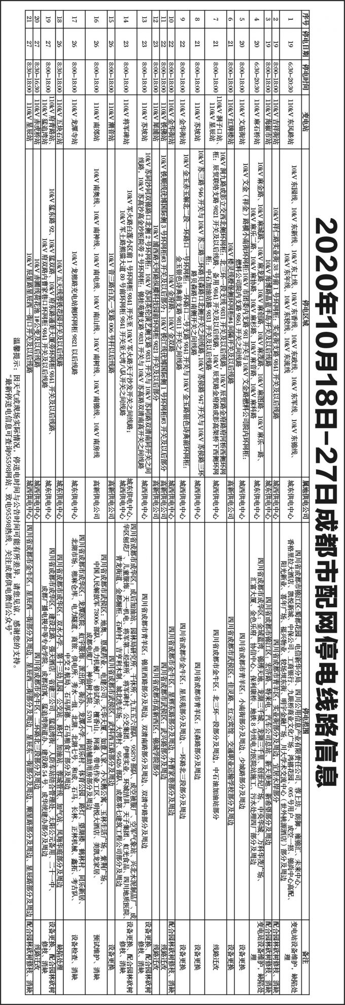 9日,国网成都供电公司发布了《2020年10月18日—27日成都市配网停电线路信息》,具体信息如下: