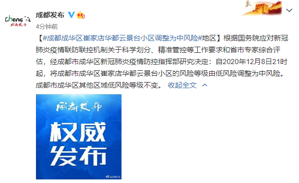 根据国务院应对新冠肺炎疫情联防联控机制关于科学划分、精准管控等工作要求和省市专家综合评估,经成都市成华区新冠肺炎疫情防控指挥部研究决定:自2020年12月8日21时起,将成都市成华区崔家店华都云景台小区的风险等级由低风险调整为中风险。成都市成华区其他区域低风险等级不变。