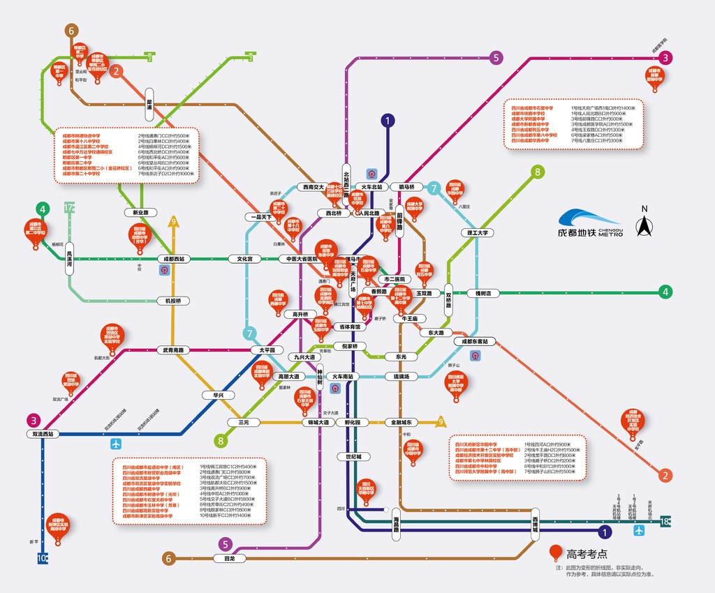 为了让广大考生及家长们对赴考出行信息“一目了然”,成都地铁推出了电子版“高(中)考考点地图”,涵盖各个考点位置及毗邻地铁站、地铁线路指引等信息,可以为考生及家长科学合理规划出行路径提供参考。为帮助考生快速、准确找到离考点最近的出站口,全线网29座高考考点站和42座中考考点站的出站闸机及邻近考点的出入口通道均设置了考点指引牌,指引考生节约出站时间,提高出行效率。