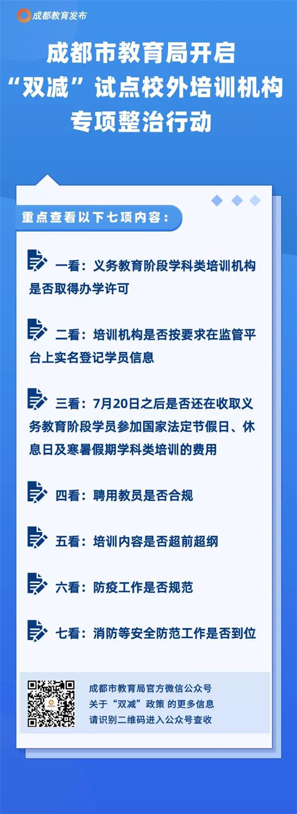 为进一步巩固全市规范校外培训机构专项整治行动的成果,成都市教育局近日印发通知,开启了“双减”试点校外培训机构治理工作督办暨专项整治行动“回头看”。