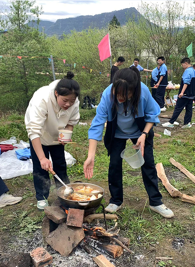 远离了学校的忙碌,前往与春的邂逅,师生们一路欢笑不断,尽情享受无尽的快乐时光。到达基地,每个同学迅速在团队中找到自己擅长的“角色”:或抱柴生火,或择菜切肉,或掂锅弄勺,或摆盘铺桌,忙得不亦乐乎,却又井然有序。没过多久,一道道可口的佳肴映着春辉陆续出锅上桌,和着春的暖阳醉红了师生的笑脸。老师们也没闲着,土鸡腊骨香锅、麻辣火锅、牛肉汤锅……老师们的巧手让学生惊叹不已——咱们的老师原来不仅能在课堂上挥洒自如,而且在生活中也是“能工巧匠”!师生们围在一起,坐的坐、站的站,尽情分享劳动成果,笑容满面,如三月春花的灿烂。