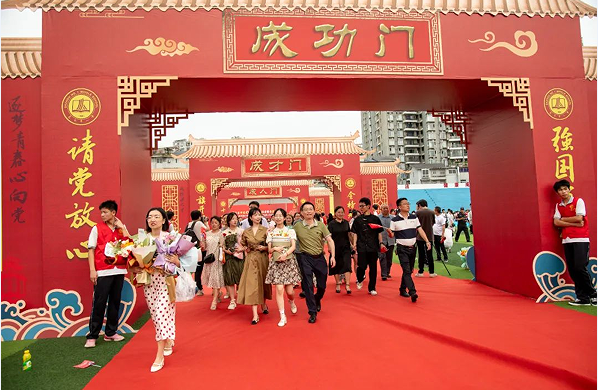 活动现场,在歌曲《走向复兴》音乐声中,满怀希望、意气风发、朝气蓬勃的高三学子们,在老师的带领下,在家长的陪伴下,伴随阵阵掌声盛装出场。他们走上红地毯,迈着坚定的步伐,以整齐有序的队列奔向象征成功和未来的“成人门、成才门、成功门”。