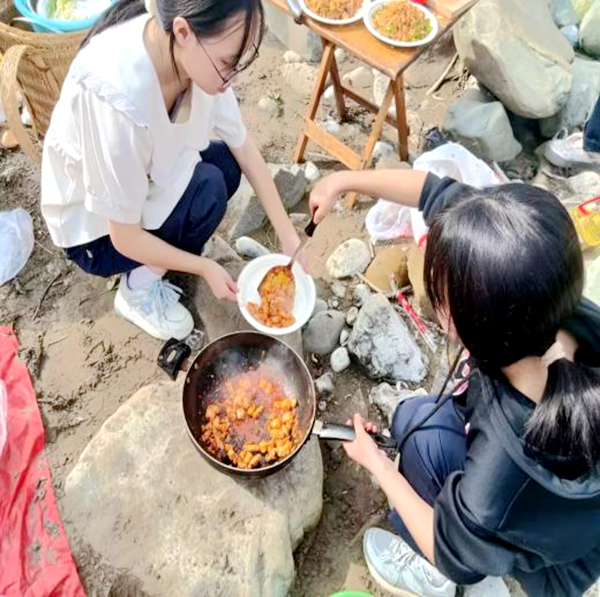 到达目的地后,各小组迅速行动起来,开始搭建炉灶、生火做饭。同学们纷纷展现出自己的生活技能,有的洗菜切菜,动作娴熟;有的掌勺烹饪,架势十足。不一会儿,空气中就弥漫着阵阵饭菜的香味。