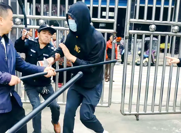 上午9:50左右学生们正在操场参与大课间活动,一男子趁学校工作人员进校门时闯进学校,保安立即上前劝其离开,该男子不听劝告继续往校内闯,并拿出利器意冲向学生活动区,进校教师迅速向校长报告,另一值班保安第一时间按下一键报警器报警、迅速拉响反恐警报。