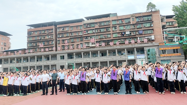 晨光微熹,国旗护卫队迈着铿锵步伐护送国旗入场。在庄严的国歌声中,五星红旗冉冉升起,全体师生肃立注目。