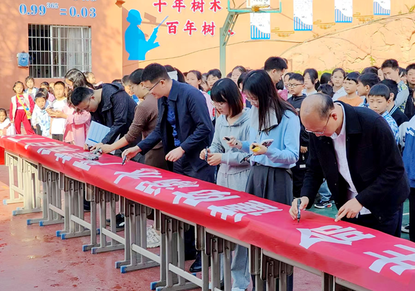 教育大会结束后,校长带领全体师生在"生命至高无上,溺水警钟长鸣"主题横幅上郑重签名,承诺遵守防溺水规定,珍爱生命。