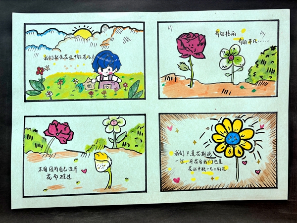 书画展区吸引了大批学生流连驻足:“献给自己的三行小诗”和“心理四格漫画”鼓舞着每一位同学,“献给春天的贴画诗”和植物拓染展现了同学们的非凡创意,班徽设计独具匠心,更体现出班级凝聚力。