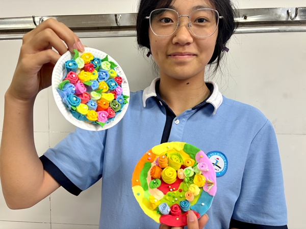 艺术疗愈促进情绪外化与自我觉察,粘土塑形将隐喻情感具象化。同学们排着整齐队伍,领取心仪色彩的超轻黏土和圆盘,鲜花、薯条、三明治、校徽、奥特曼……一个个鲜活有趣的物体飘然而至。同学们用艺术载体实现自我接纳与压力转化,建立起非语言疗愈路径。