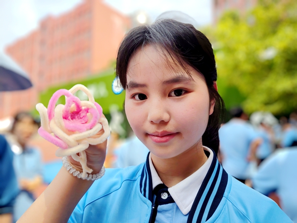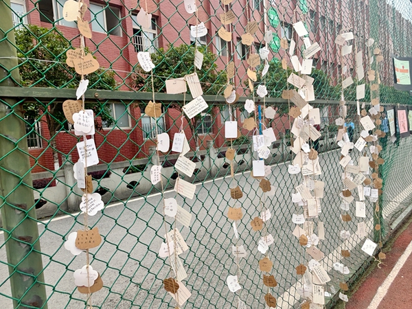 高一高二的同学们完成作品后,悬挂于网架上,等待高三的学长学姐领取,每一朵小红花都是一份心意,一份祝福,一份温暖,一份激励……