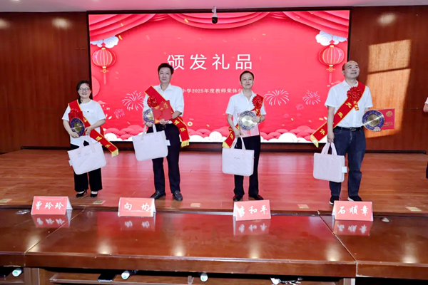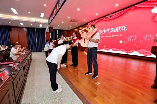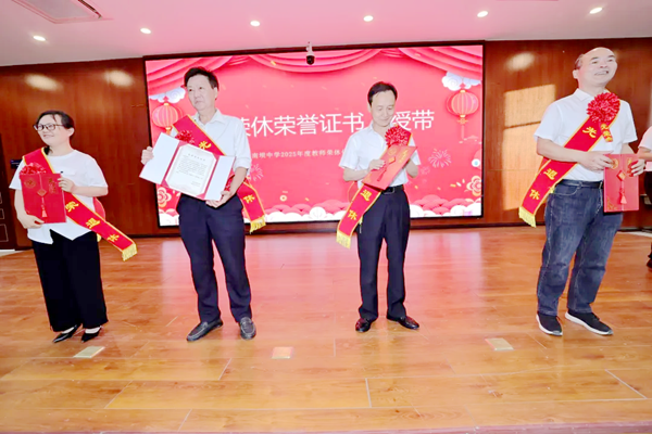 在悠扬的乐声中,四位老师从学校领导手中接过荣休奖杯、证书与纪念礼品。学生代表手捧鲜花奔上讲台,用深深的鞠躬与拥抱诉说感恩,分散在各地的学子也通过视频送上祝福。那一刻,四位老师眼中闪烁着激动与幸福的泪花,也让无数与会教师为之动容。